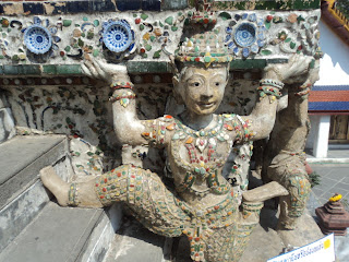 Wat Arun, I think, is a differently style or from a different time period of Thailand's history. I hazard to say the Lanna Era, but am not really sure. It is not as gold and glittery as Wat Phra Kaew--not at all, but it still quiet beautiful. I like the old. And you can tell there is history and stories in the walls, even if you can't read/decipher them.
